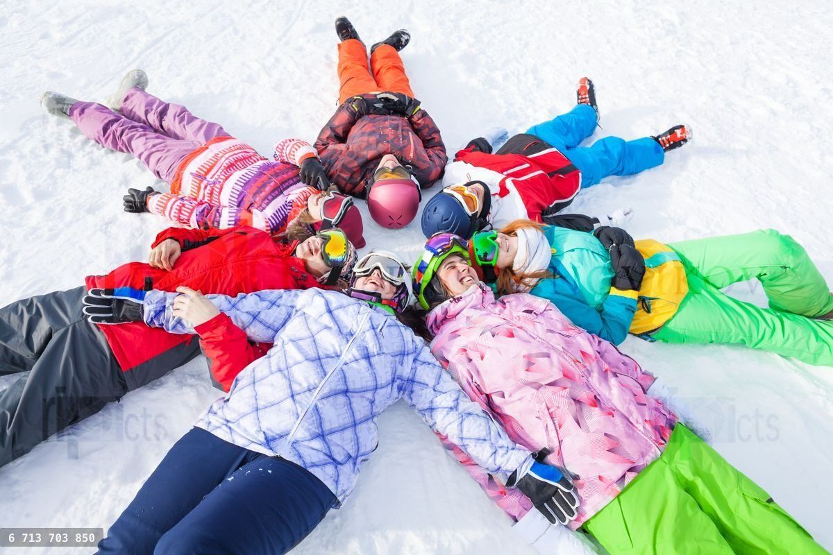 Seven cheerful happy friends lying in a circle on the snow wearing gogglesLoading purchase options...