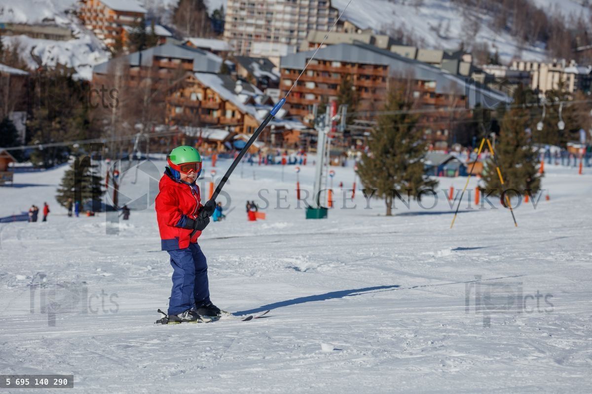Child ascend on tow lift at sunny day in a mountain resort area