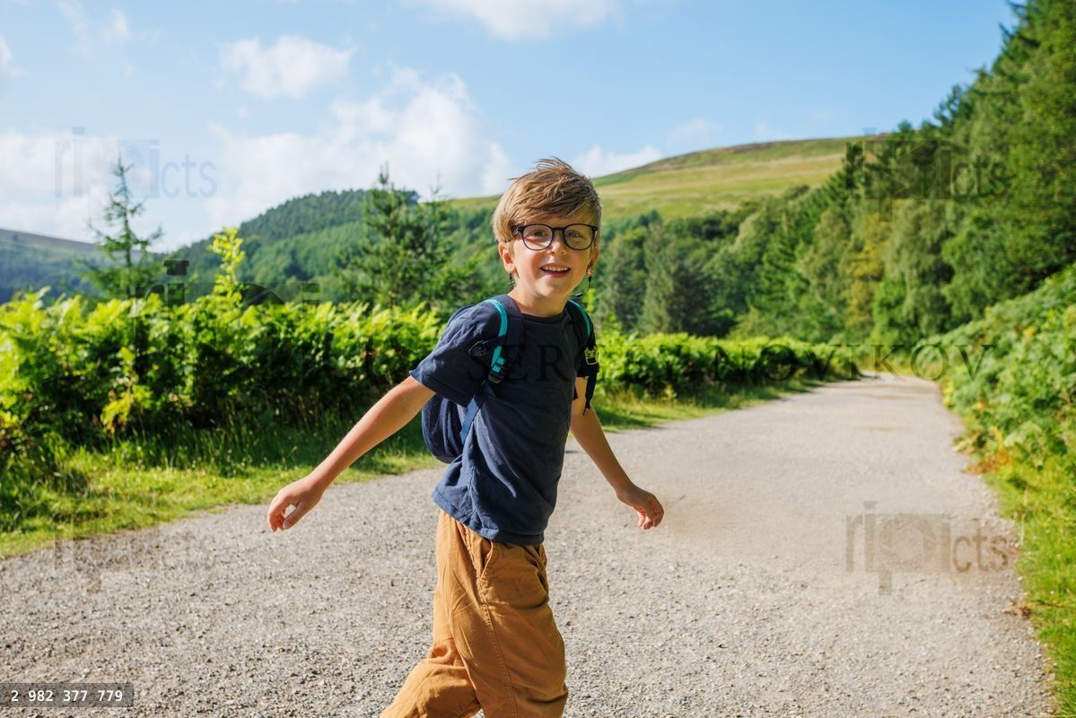 A young boy with glasses walks joyfully on a gravel path surrounded by lush greenery at Upper Derwent Valley, EnglandLoading purchase options...