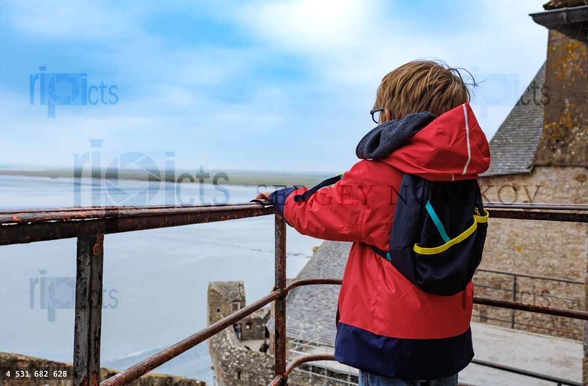 Child boy enjoying seaside view from a Mont Saint Michel wall