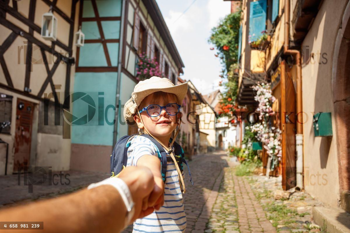 Child boy leads through charming, colorful street of Eguisheim