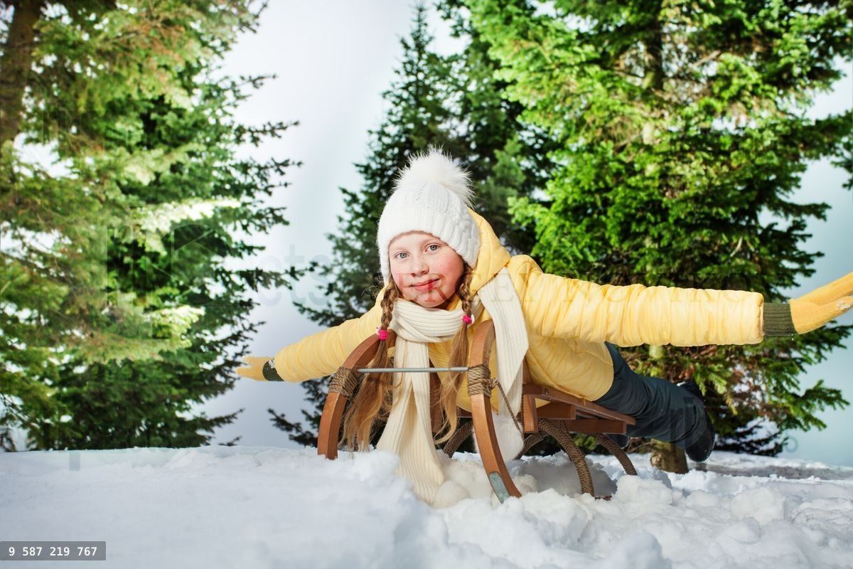 Child girl riding a sledge outdoors in snowy forestLoading purchase options...