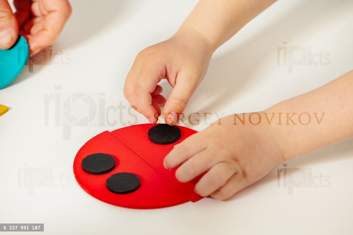 Close-up of a kids hand put together shapes to create a bug or beetle on the tableLoading purchase options...