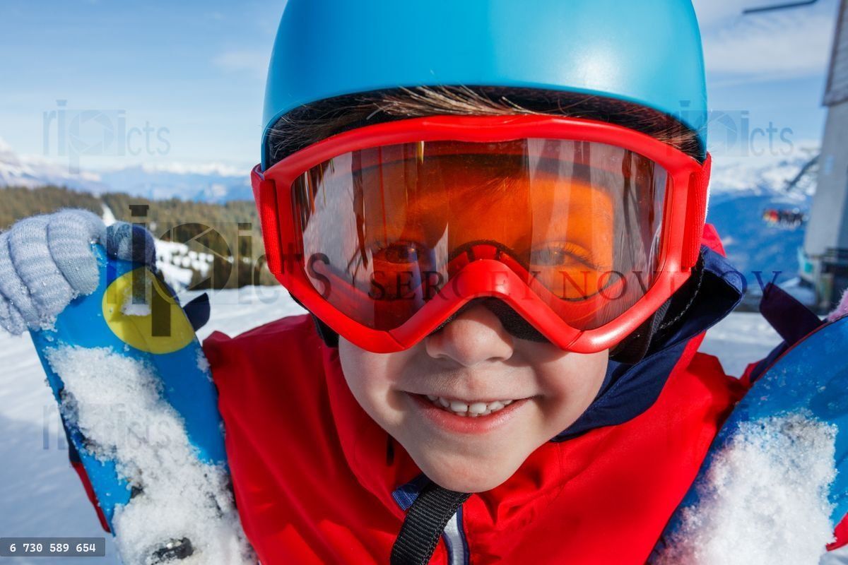 Funny closeup portrait young skier with a blue helmet and red goggles he smiles at the camera while holding snowy skisLoading purchase options...
