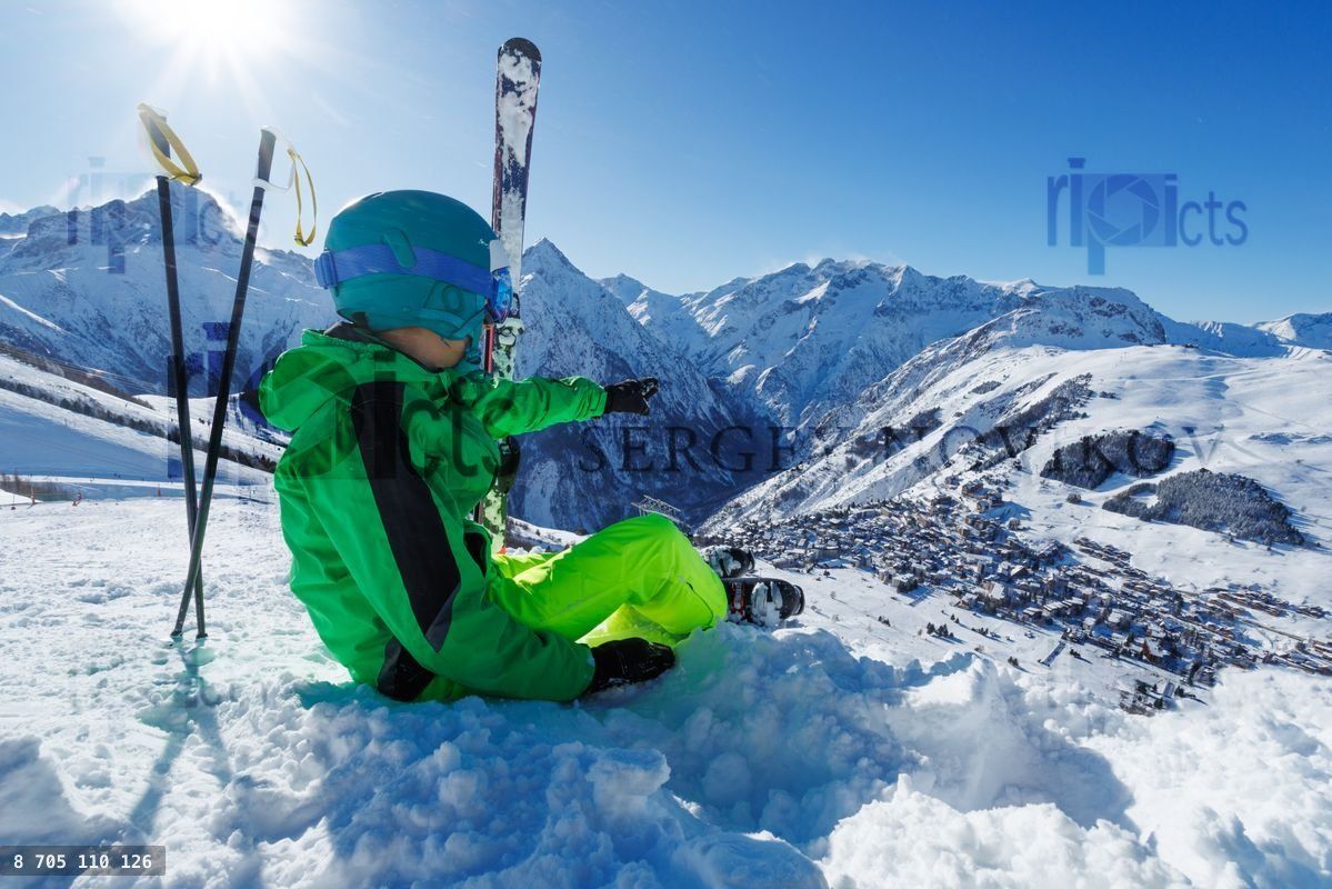 Child in green jacket relaxes on snowy ridge with skis aside