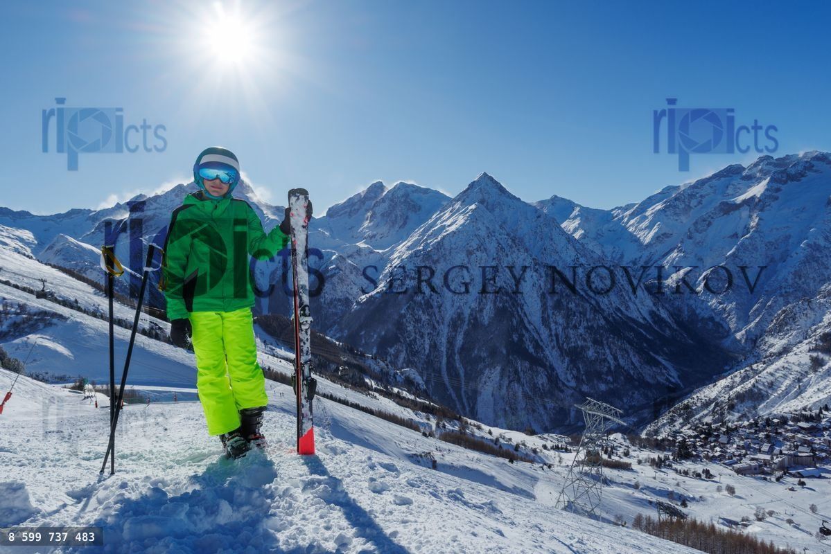 A skier teenage kid rest on summit, hold ski, wear neon-green gear gazes out over a sweeping valley, snow-draped peaks rolling off to the horizon under a vibrant blue skyLoading purchase options...