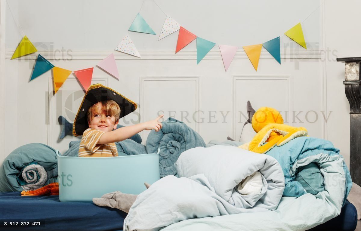 A young boy wearing a pirate hat sits in a blue bin, pointing forward while surrounded by rolled-up blankets and a plush toy, with colorful bunting hanging on the wall behind himLoading purchase options...