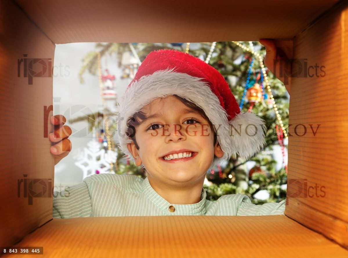 Child looks in present box wearing Santa hat with Christmas tree on background getting hands insideLoading purchase options...