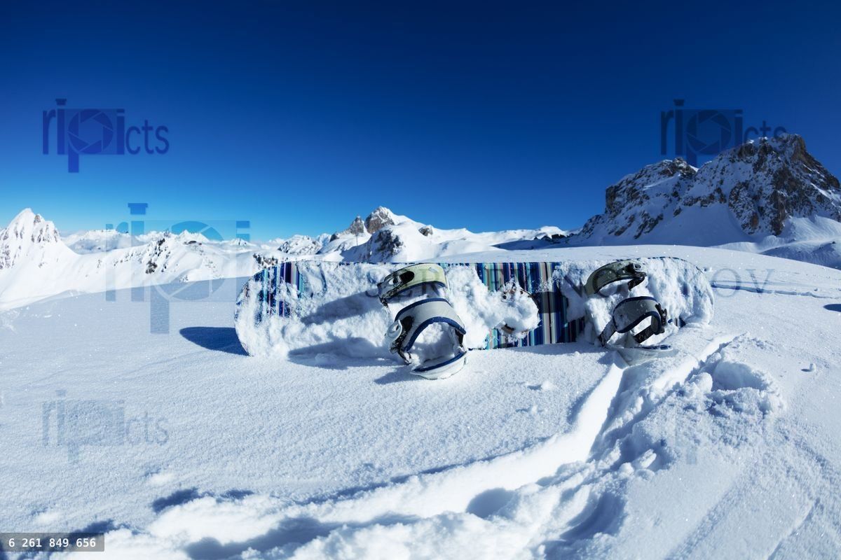 Photo of child snowboard lay in the snow on top of the mountains over blue sky on sunny day on ski resortLoading purchase options...