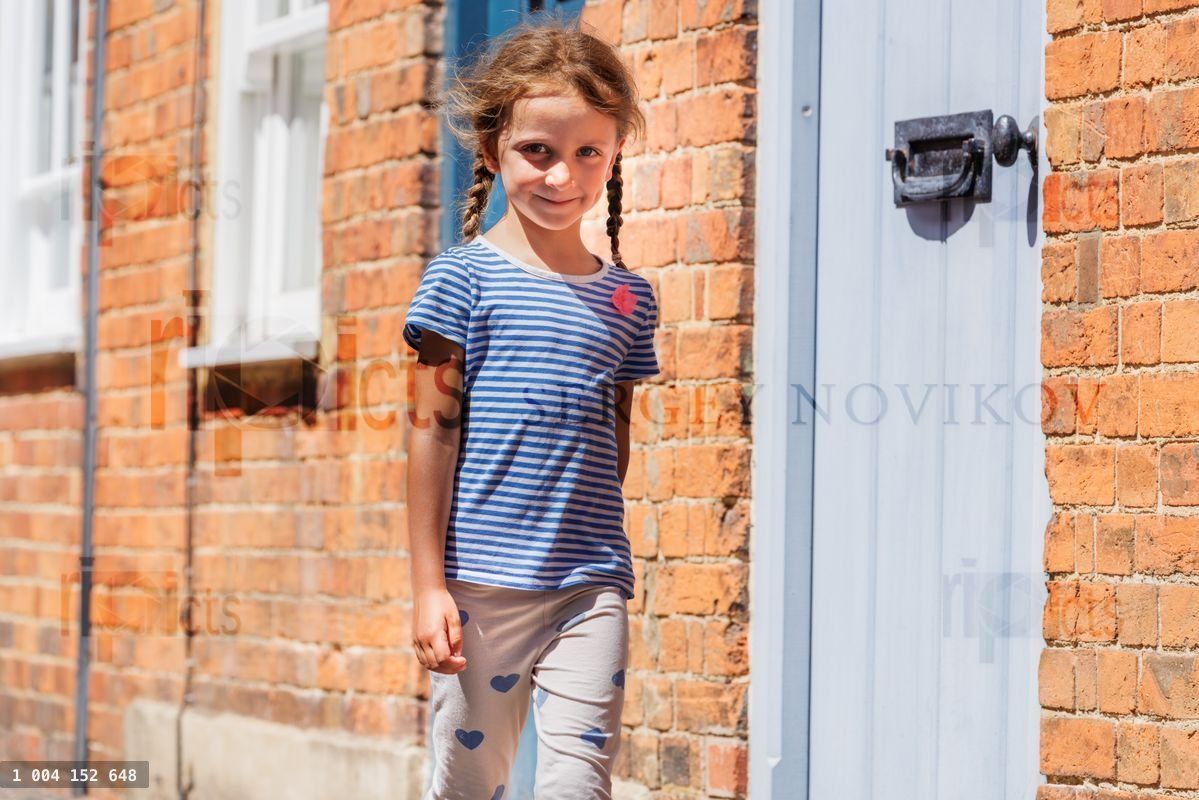 A little girl is seen making her way beside a sun-drenched brick wall with white-framed windows in lovely small town in EnglandLoading purchase options...