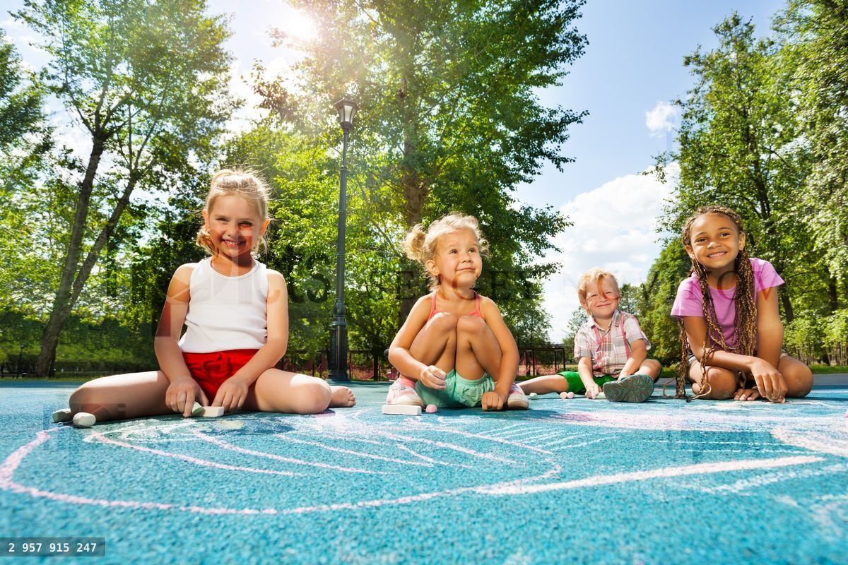 Four happy ids drawing on the playground with chalk sitting and smiling on sunny summer dayLoading purchase options...