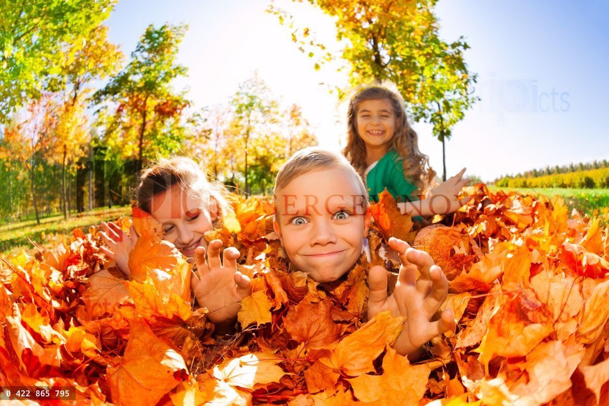 Children have fun laying on the ground with leaves