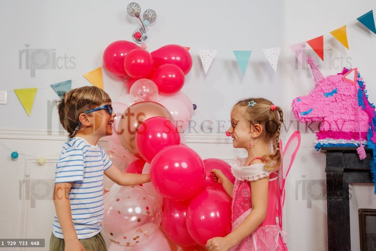 Two happy children, one boy with glasses and a striped shirt, a cute girl in a pink fairy outfit, are surrounded by a festive array of balloons at birthday partyLoading purchase options...