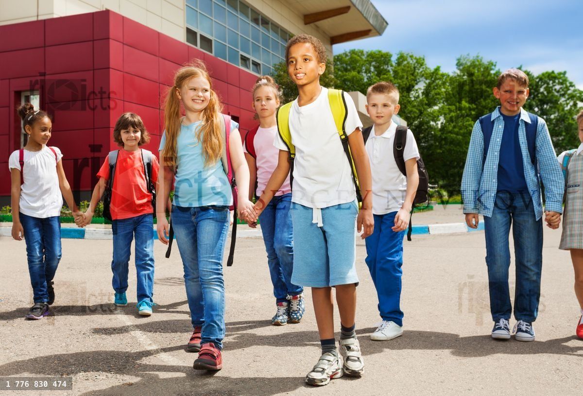 Children holding hands carry rucksacks and walk near school building during summer day timeLoading purchase options...