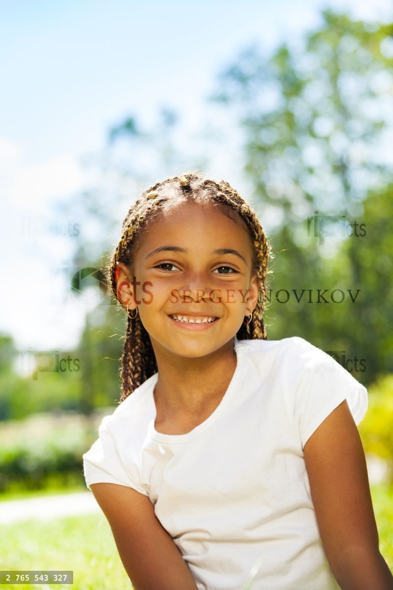 Nice close portrait of beautiful black girl with nice smile and African brides looking at camera outside in the sunny summer parkLoading purchase options...