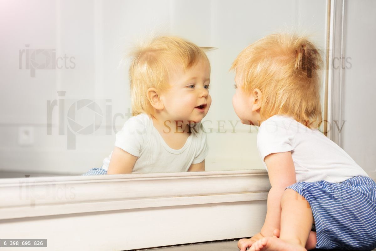 Close portrait of little blond toddler boy look in the mirror sitting on the floorLoading purchase options...