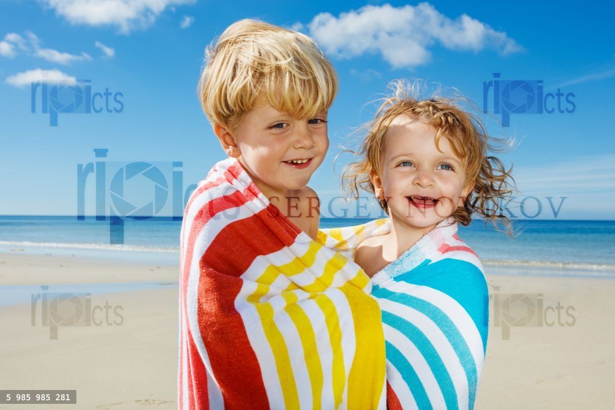 Close portrait of two lovely children blond boy and girl covered in towel getting warm after swim in the sea stand on sand beachLoading purchase options...