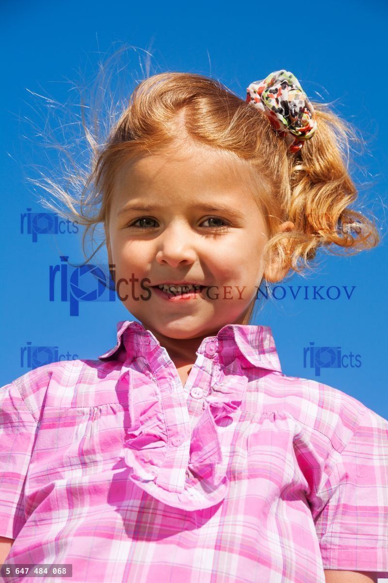 Close portrait of nice smiling little 5 years old girl in pink shirt standing with sky on background shot from low angleLoading purchase options...