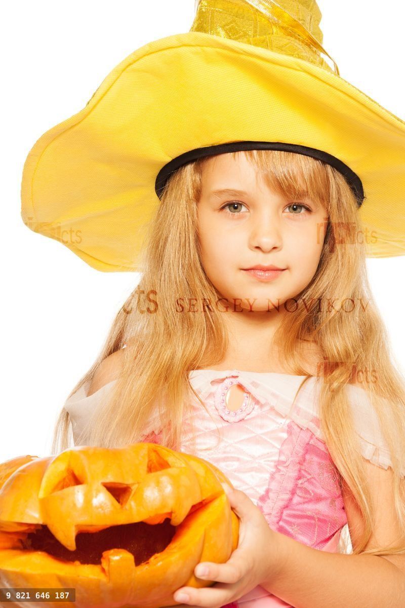 Beautiful little girl standing holding carved pumpkin and wearing Halloween yellow hatLoading purchase options...