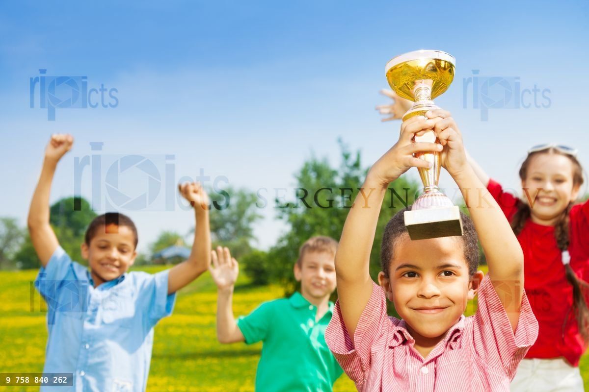 Close shoot of black happy smiling little boy holding prize cup with group of boys and girls on backgroundLoading purchase options...