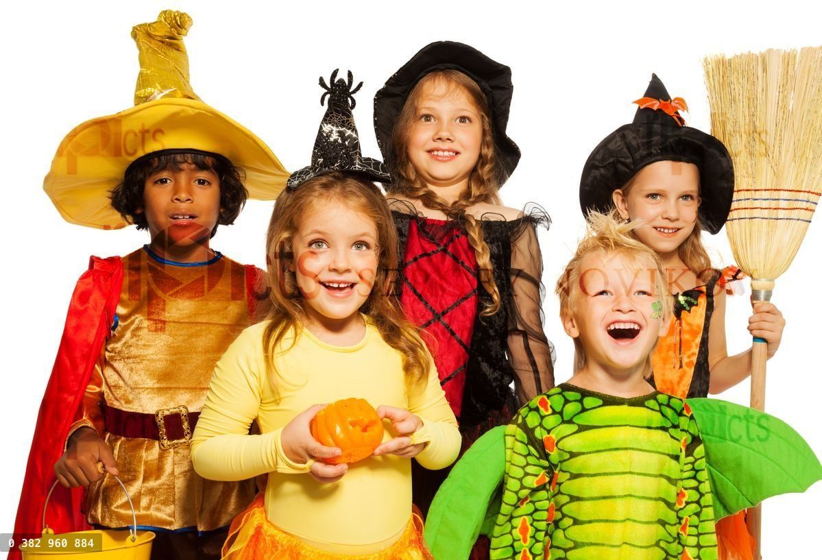 Close portrait of boys and girls in Halloween costume with broom, pumpkin and bucket standing together isolated on whiteLoading purchase options...