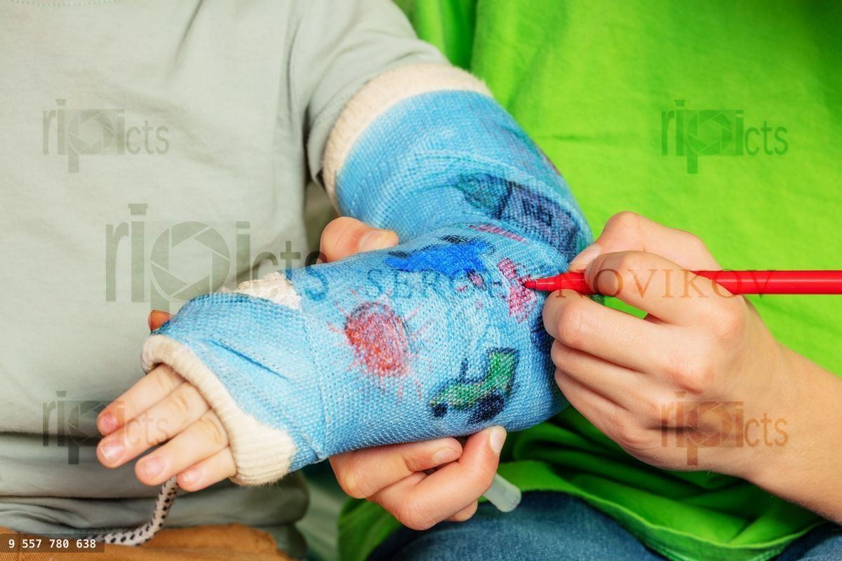 Close up of a boy draw with felt tip pen on broken hand cas