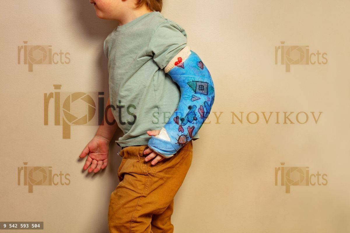 Close-up portrait of a child broken hand in plaster cast after accident in kids drawings hearts, cars, sunLoading purchase options...