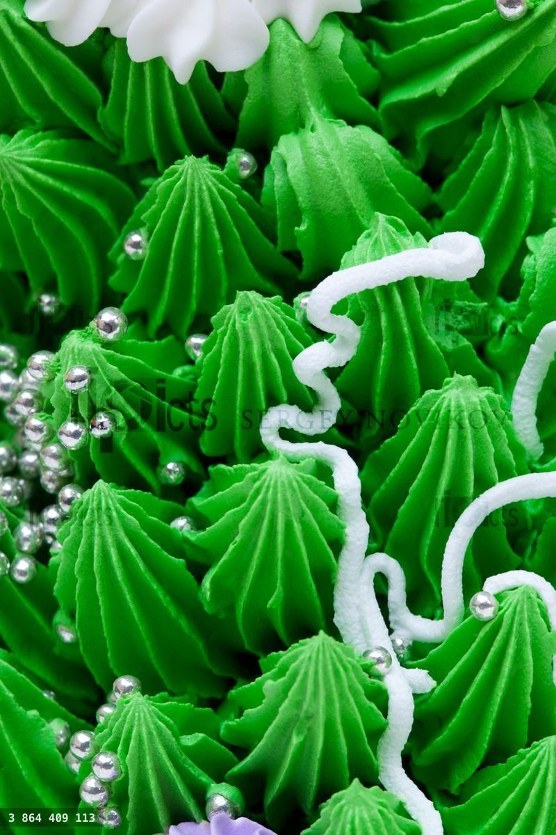 Close up of a green confectioner cake cream and decorationsLoading purchase options...