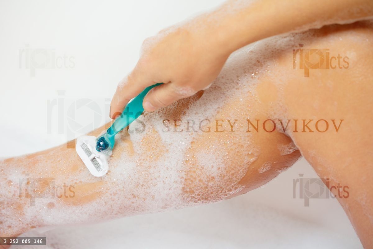 Close-up of a woman who shave legs in the bathroom with razor and shaving foamLoading purchase options...