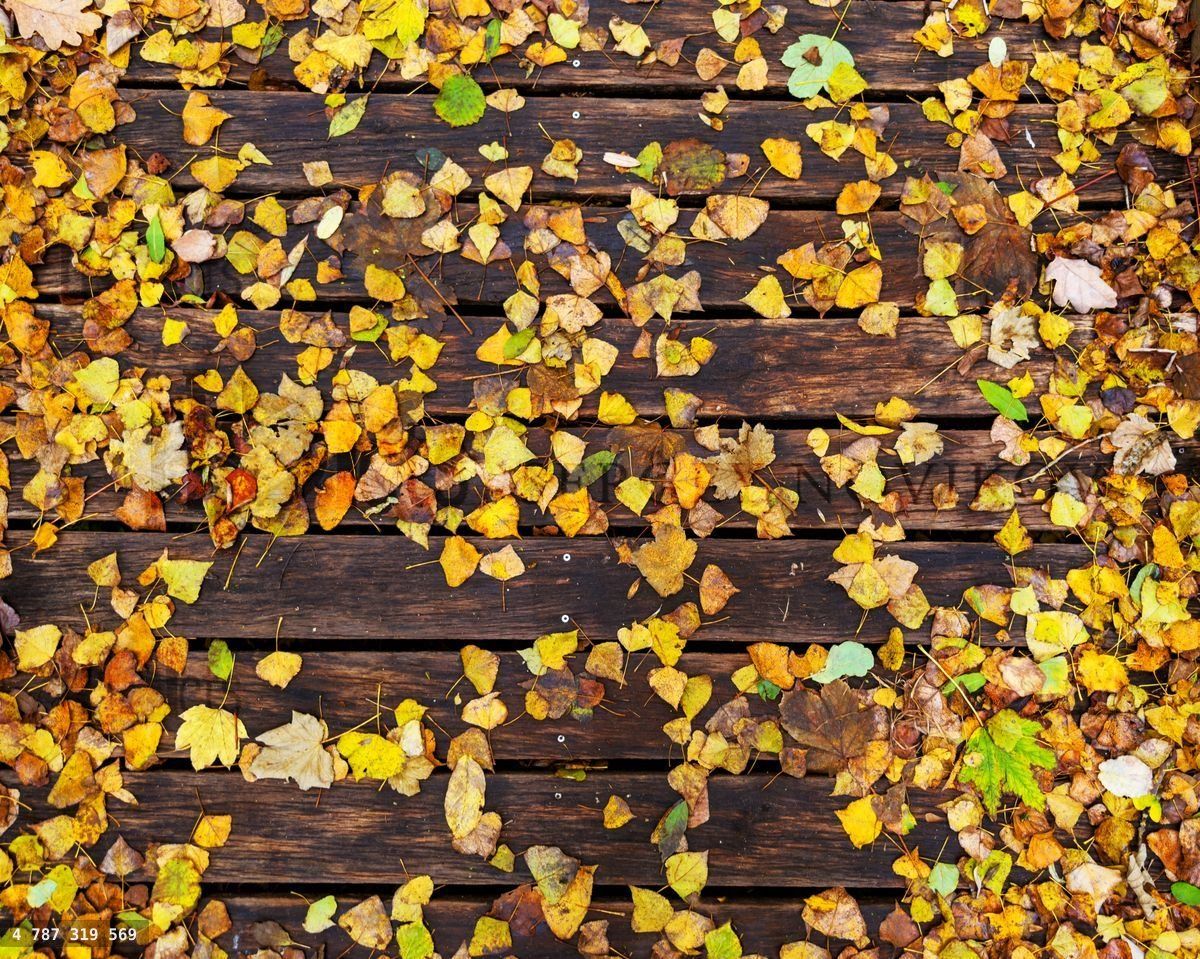 Close-up of a wooden pathway covered with autumn leaves