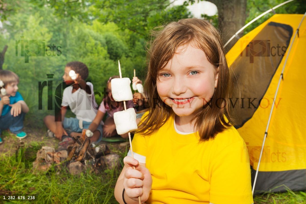 Close-up of girl holding stick with marshmallows near tent in the forest with other childrenLoading purchase options...