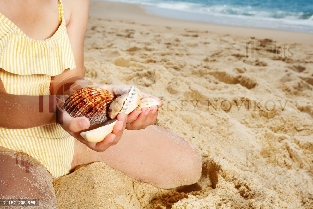 Close-up of hands with seashells on a sunny beach by the sea