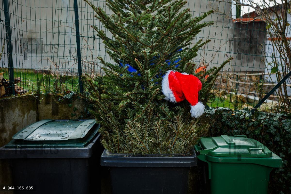 Close-up of a Santa hat on discarded Christmas tree thrown into a trash bin on the street after the end of year celebrationsLoading purchase options...