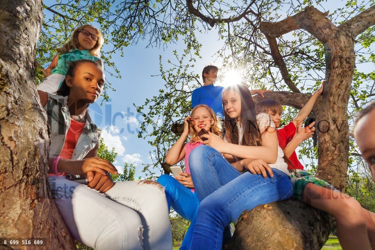 treeleavesnaturesitsittingonholdtrunksummergirlchildrenkidsteensteenagerboyguysteammatchfriendsCaucasianAfricanblackmanydiversityinternationalhappysmilelooktogetherplaygameleisurehighclimbparksunlightclose-upmobilechildkidlifestylefriendgroupclimbinghangingsmartphonephonefunhangoutup
