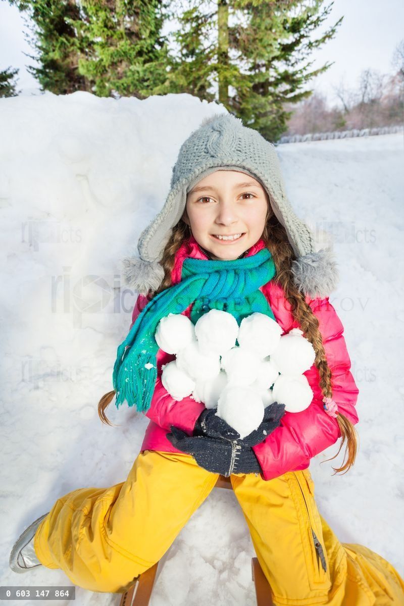 Close-up photo of smiling girl in colorful winter clothes holding snowballs near the snow fortressLoading purchase options...