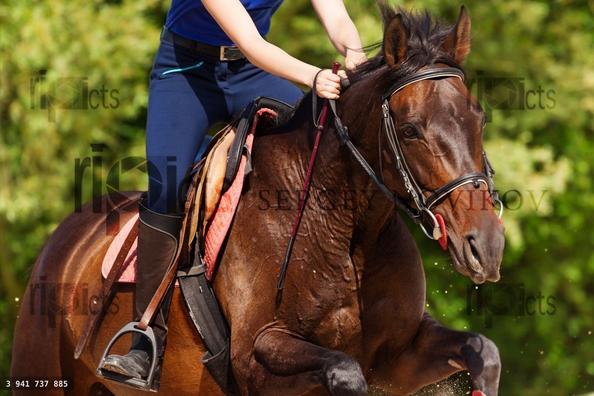 Close-up picture of bay horse with rider running at racetrack during competitionLoading purchase options...
