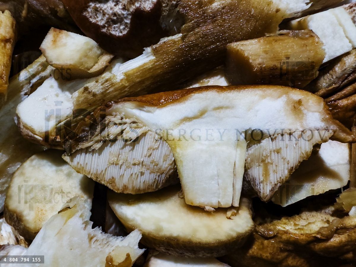 Close-up of a top part of a Penny Bun Fungus mushrooms cut to be prepared on the kitchen tableLoading purchase options...