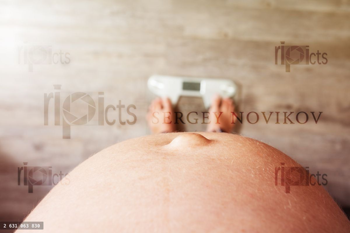 Close up view from top of pregnant belly on scales