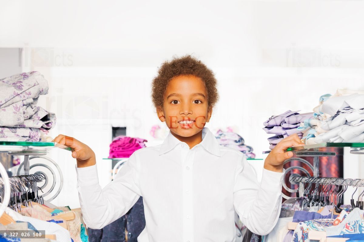 Africanblackboyclose-upcutebrightbluehappyyoungfashionsmallshoppershoppingshopaholicbeautifulkidchildhoodchildclothesclothingwardrobefashionablesmilerowselectingfunsmilingindoorstandholdholdingmanylifestyleshophanginghangershowroompositivelookone1pileshelvesmiddlebetweenstoremallchildrenkidsboys