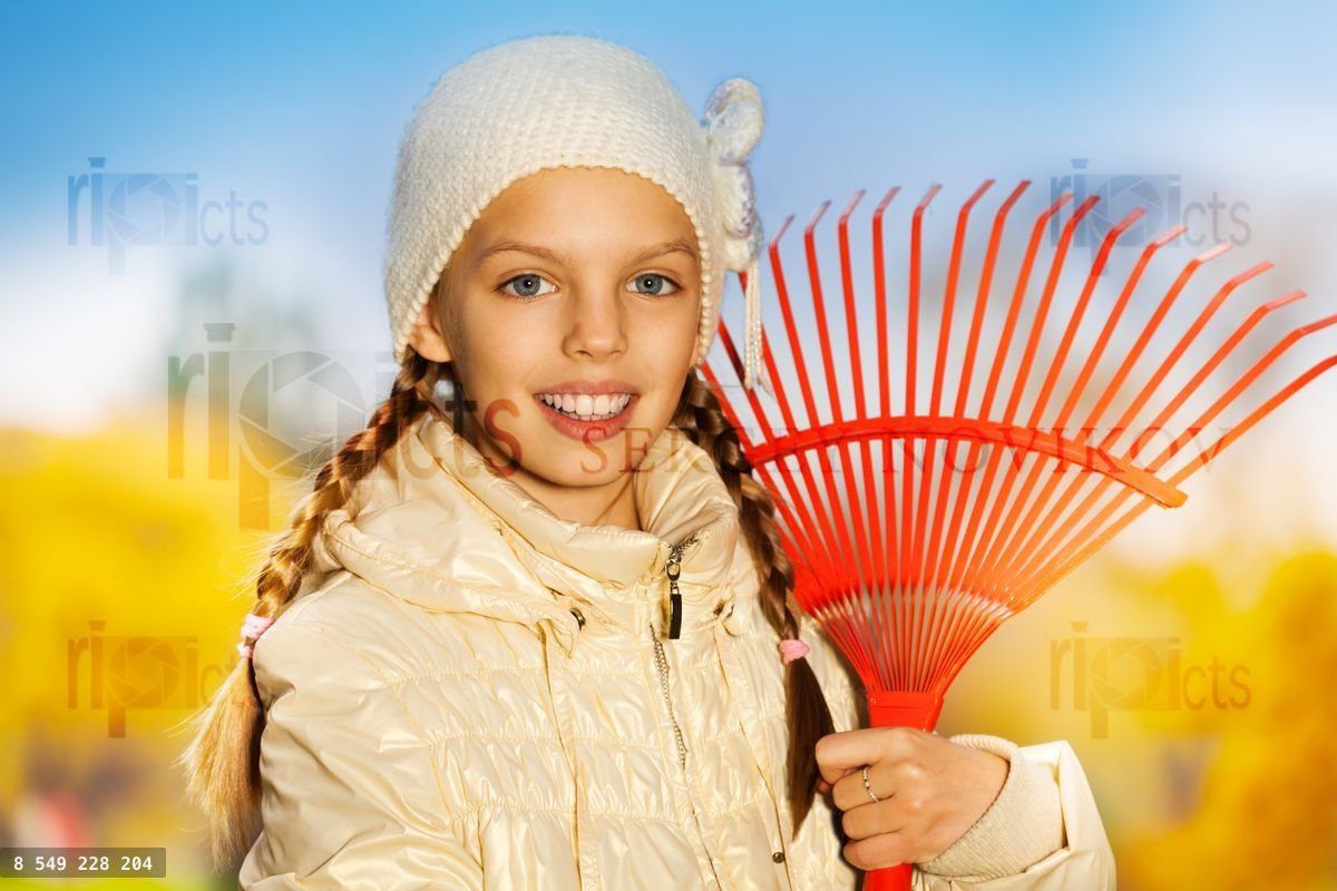Close up view of smiling girl with rake in the autumn park during daytimeLoading purchase options...