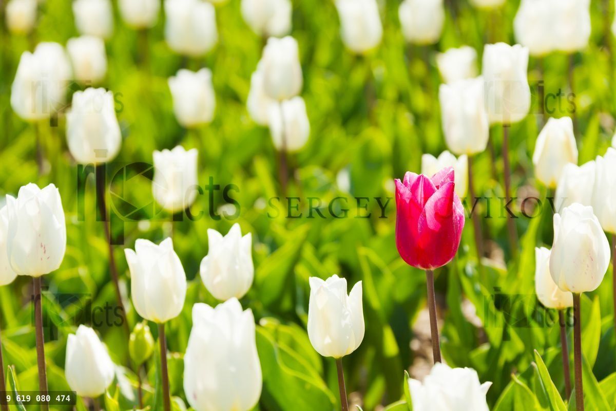 Close up view of white and one red tulip in summer