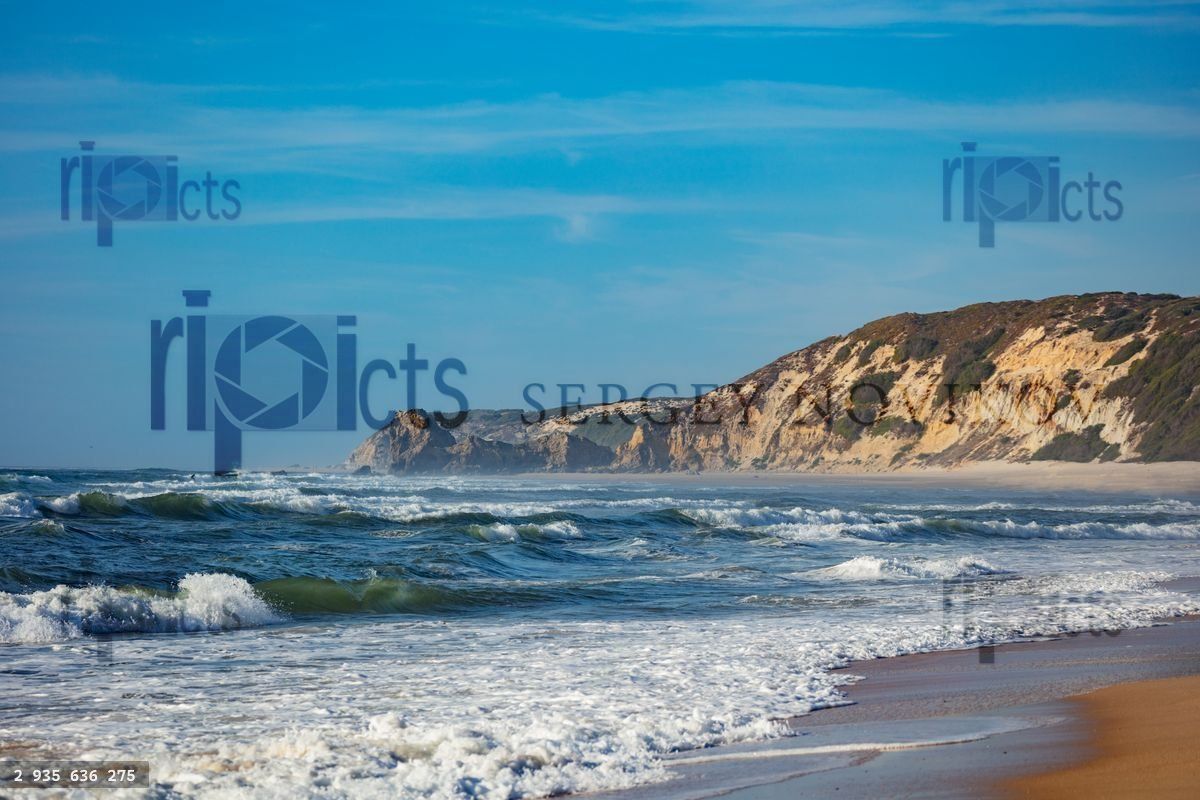 Sandy Portugal beach with foamy waves in the foreground and rugged cliffs in the distance under a clear blue skyLoading purchase options...