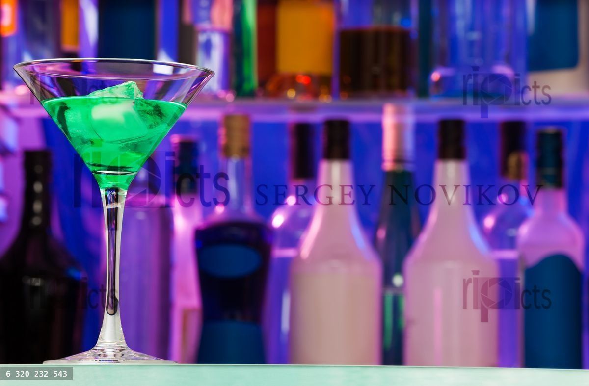 Green cocktail glass with drink in the bar with bottles on background lit with color lightsLoading purchase options...
