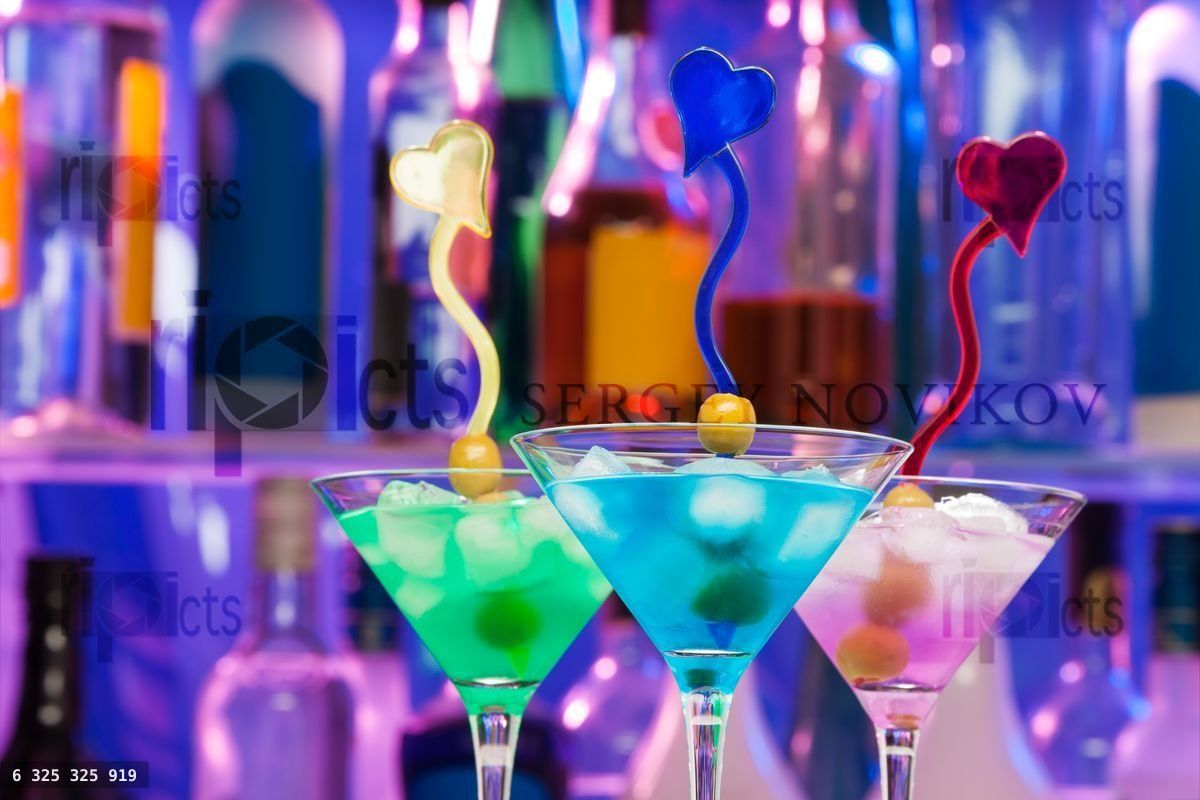 Different cocktail glasses with olives and decorated sticks drink with color lit bottlesLoading purchase options...