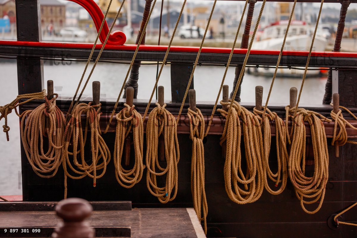 Coils of thick ropes are hanging from wooden pins aboard an old sailing ship docked in Saint-Malo, Bretagne, FranceLoading purchase options...