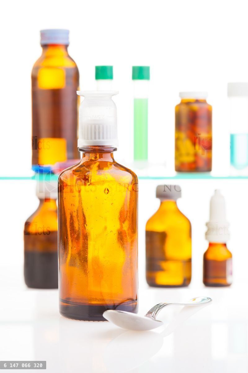 Bottle with mixture from cold and spoon on foreground with two shelves with bottles and test tubes on backgroundLoading purchase options...