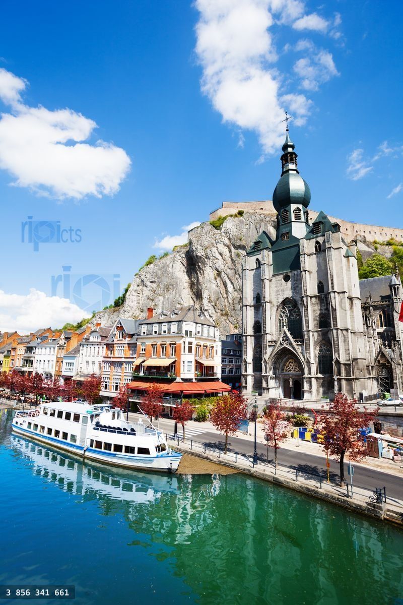 View of Collegiale Notre Dame de Dinant near Meuse river with white ship on it in Dinant, BelgiumLoading purchase options...