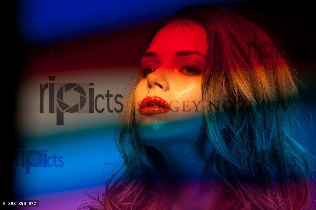 Beauty shoot of a beautiful female with blurry color filters on foreground with glossy skin and red lipsLoading purchase options...