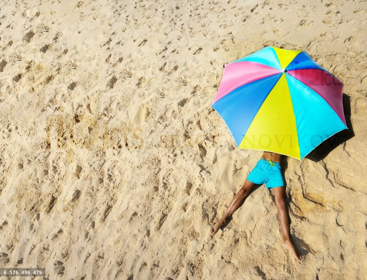View from top above of the colorful sun parasol umbrella and boy sunbath under it on the sand on the beachLoading purchase options...