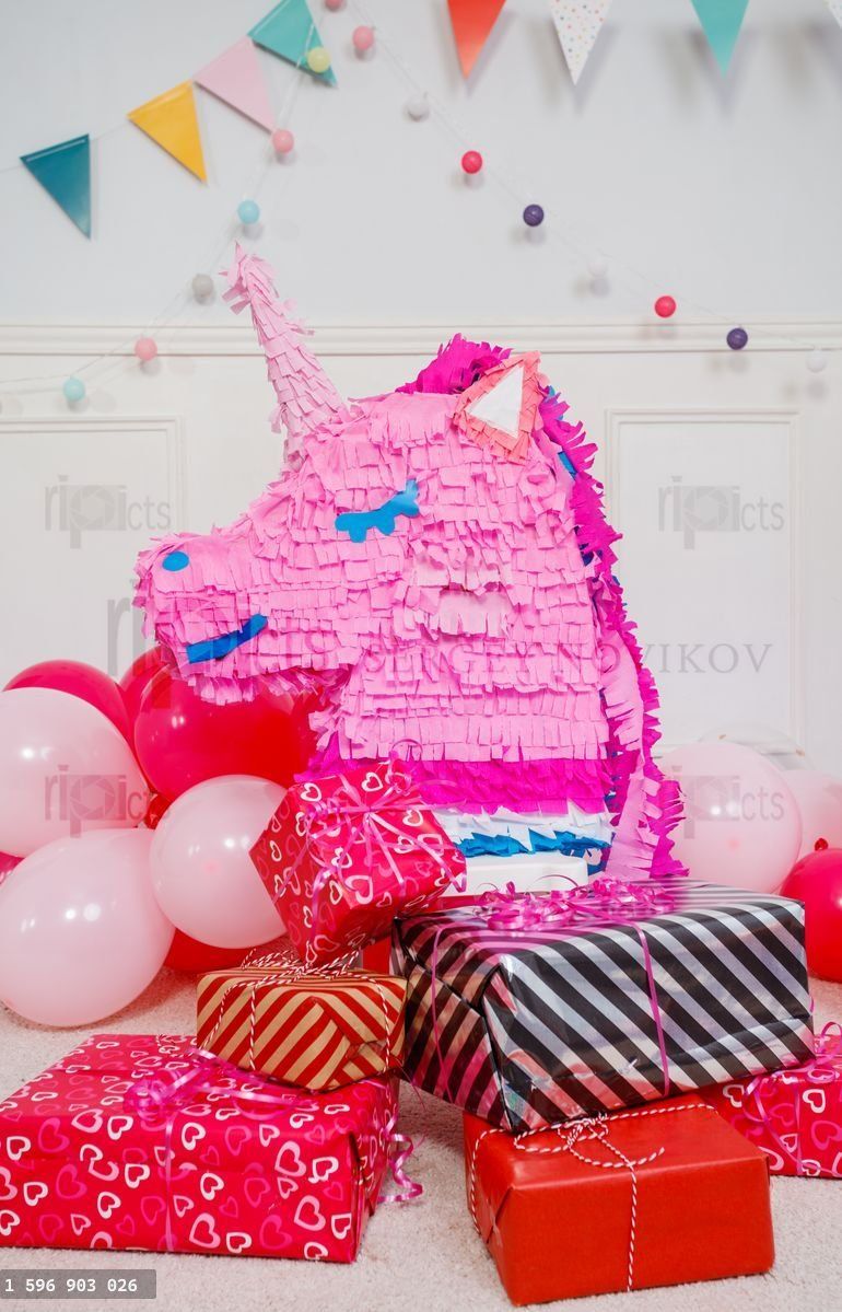 Against a pale backdrop, a festive unicorn pinata in pink is accompanied by colorful triangular flags and a string of lightsLoading purchase options...